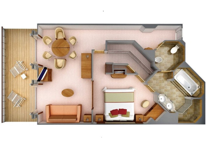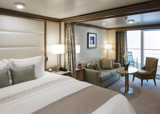 | R1 - Royal Suite 1 92 m² (vrátane balkóna 12 m²), Spálňa s obývacou a jedálenskou časťou. 7. paluba vpredu. Max 3 osoby. | 34 800 € 11 600 € za osobu | ||